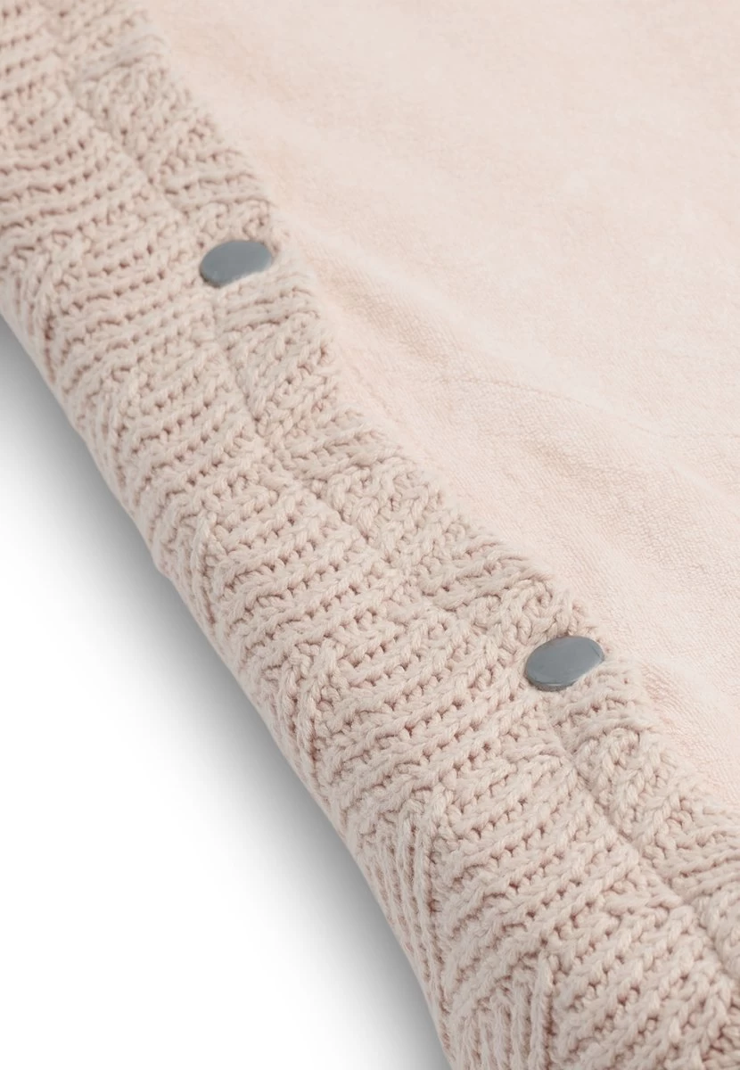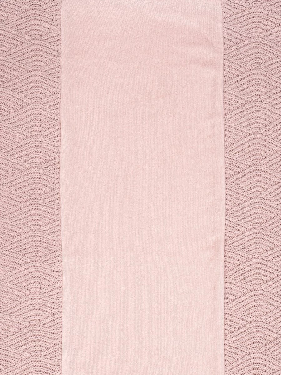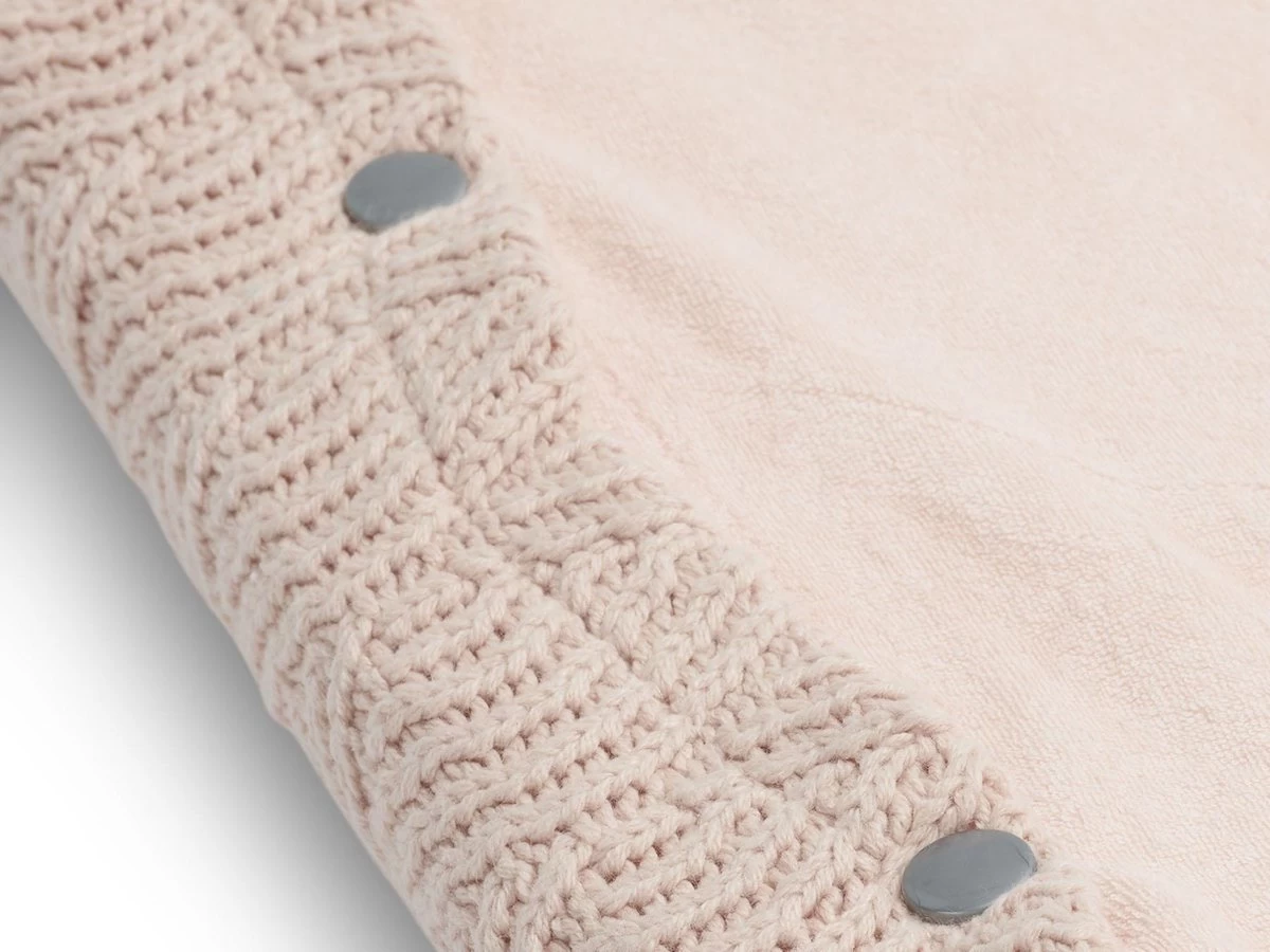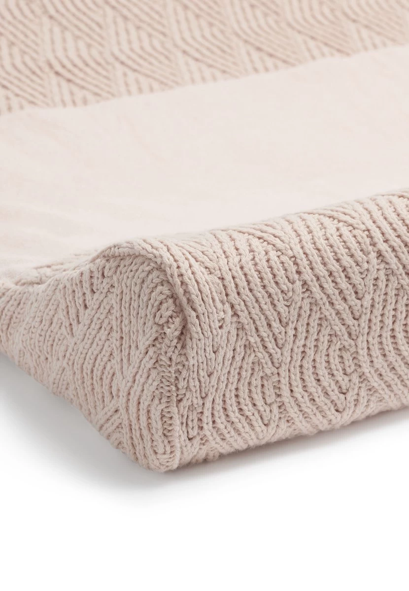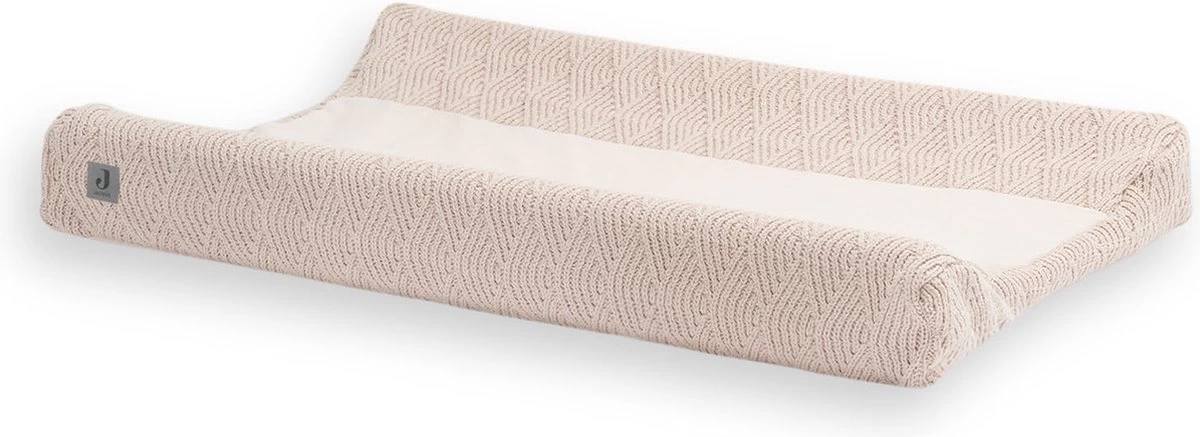 Een zachte hoes met prachtige randen van gebreide stof, gebreid in golfjespatroon. De hoes past precies om een standaard aankleedkussen en is de meest praktische basic in de babyuitzet. De stof is zacht en rekbaar en het dessin geeft een persoonlijk tintje of het maakt de inrichting van de babykamer helemaal af. De hoes sluit rondom waardoor het goed blijft zitten.