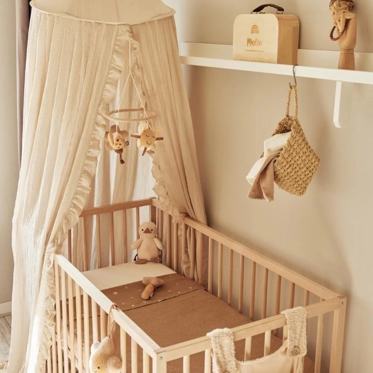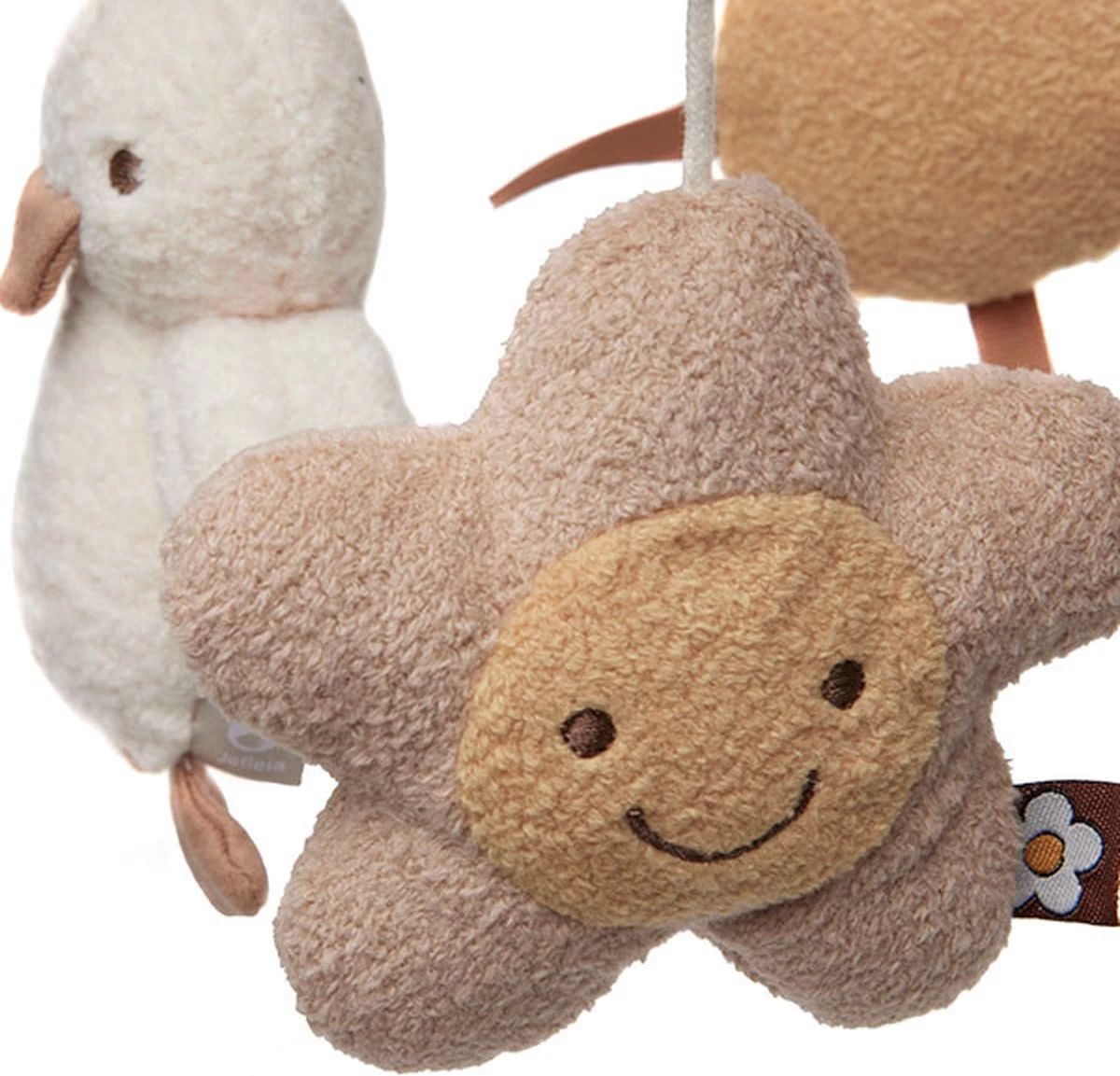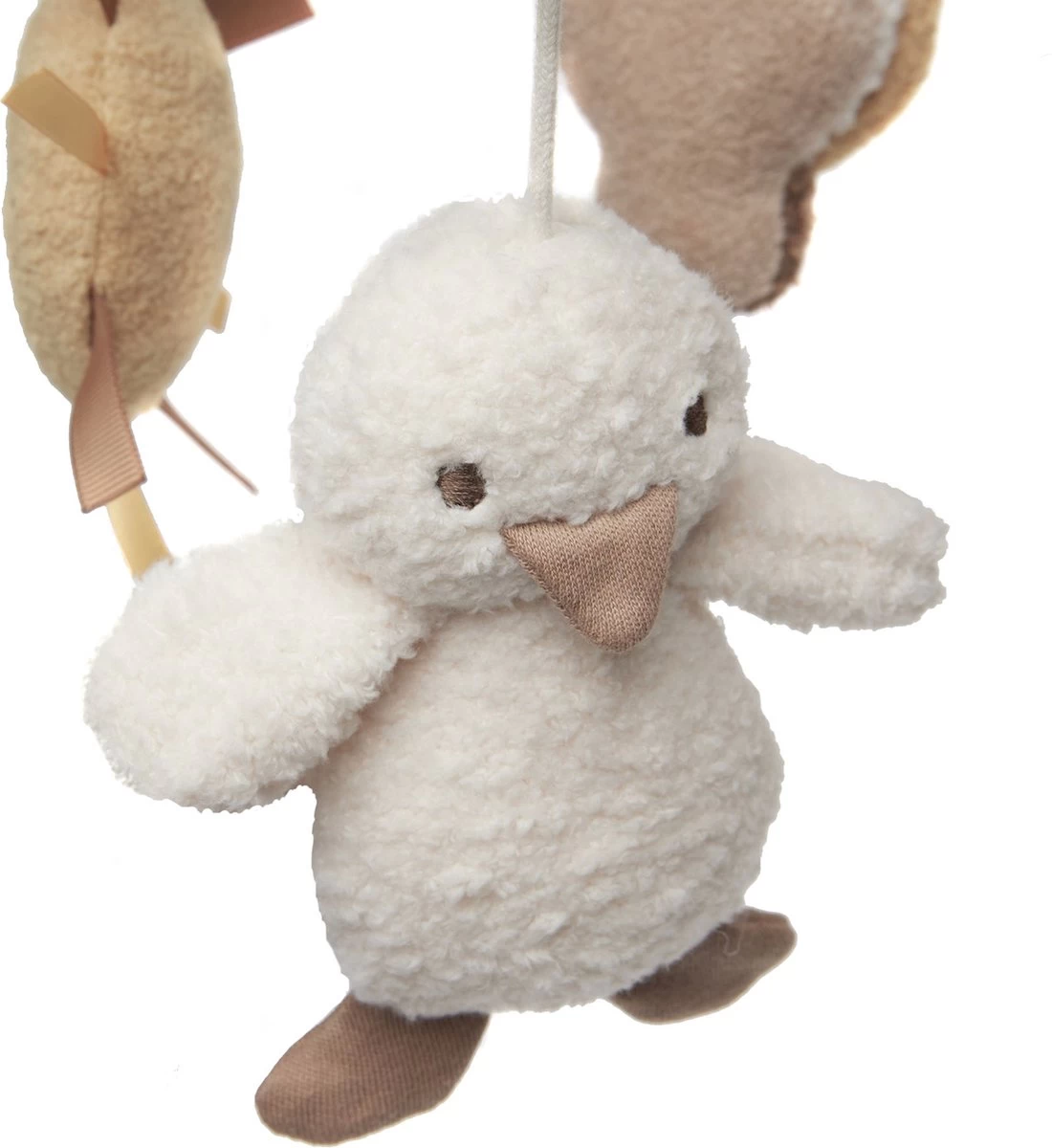 Deze leuke babymobiel heeft neutrale kleuren.
