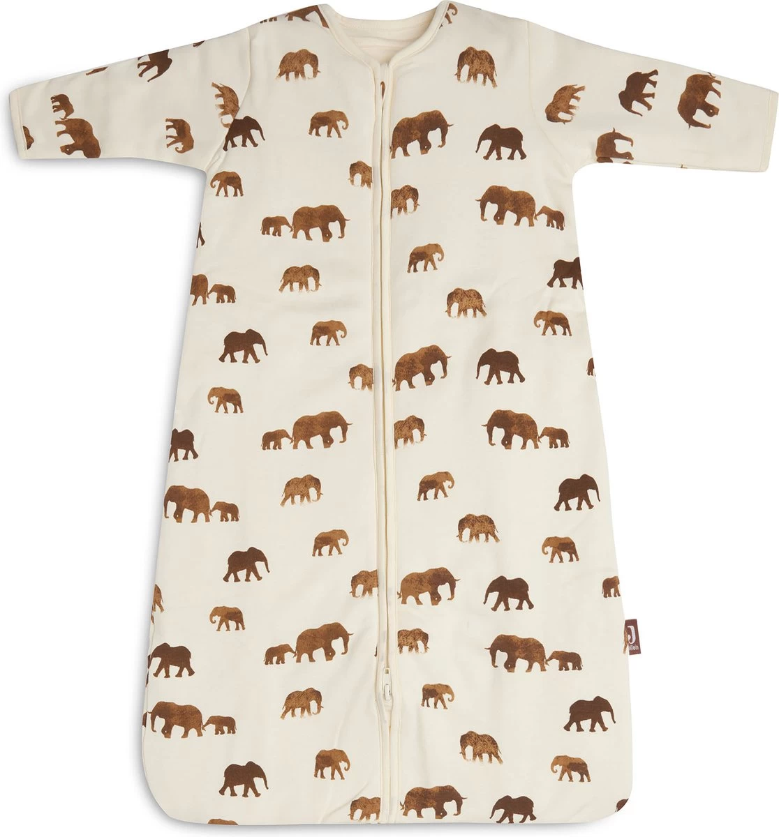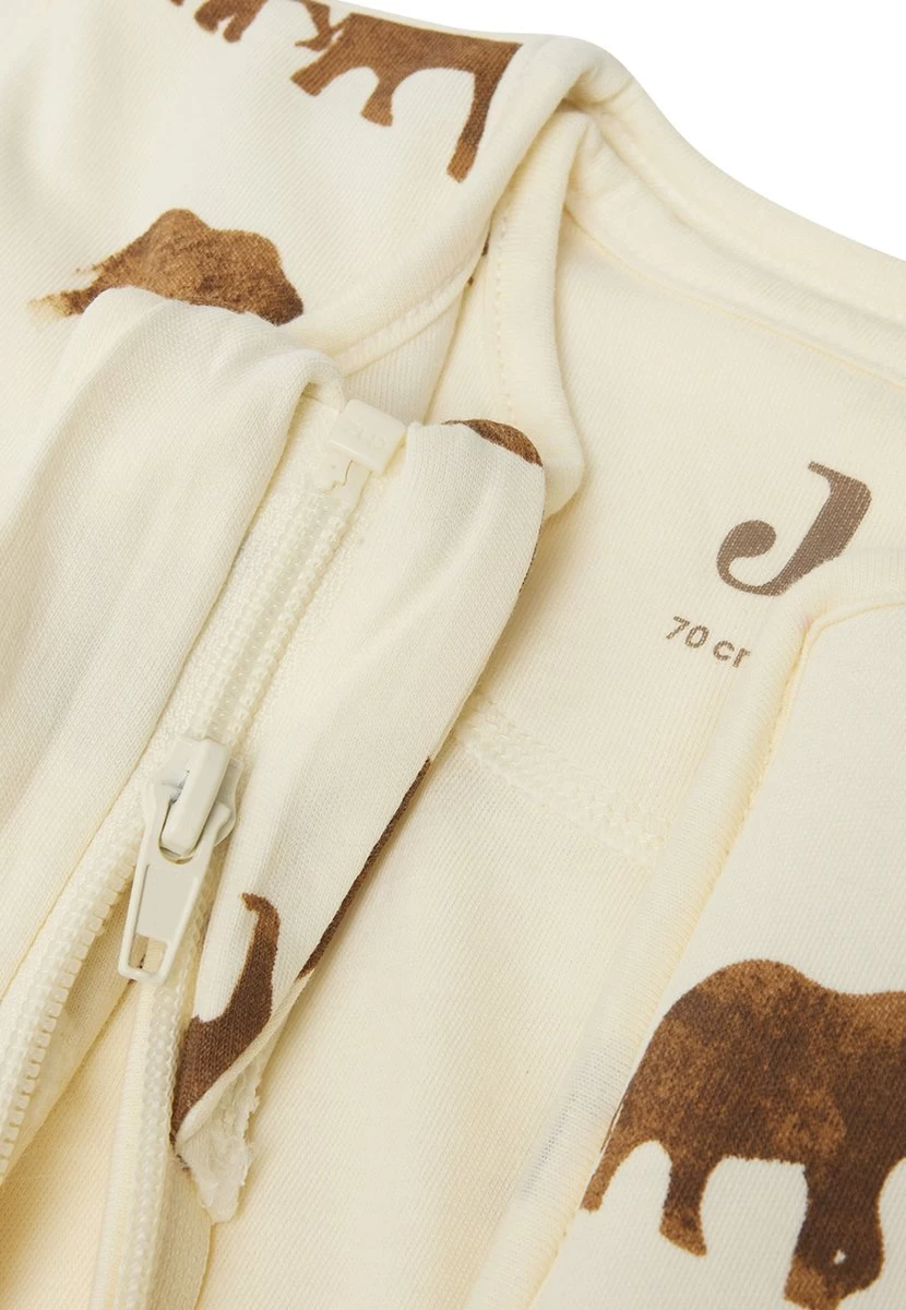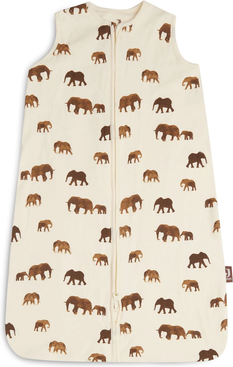 De slaapzak heeft een Ivory ondergrond en de olifantjes op de print bevatten de kleuren Caramel en Chestnut.