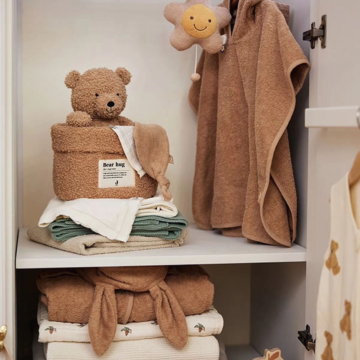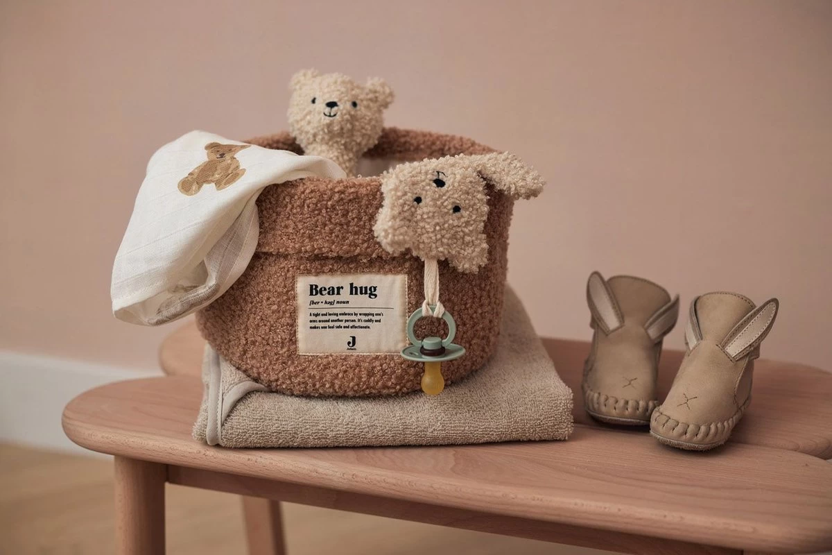Praktisch mandje van zachte aaibare Bouclé stof om spulletjes in op te bergen. Het mandje is 14 cm hoog en heeft een diameter van 18 cm. Op de voorkant van het mandje vind je het leuke ‘bear-hug’ logo. Dit mandje is superhandig voor op de commode voor de kleine verzorgingsspulletjes zoals een manicuresetje, borsteltje en een thermometer. En tegelijkertijd een leuke accessoire om de babykamer net dat extra sfeer mee te geven. Met dit opbergmandje houdt je commode lades geordend. Een mandje voor sokjes, voor verzorgingsproducten en voor slofjes. Daarnaast staat dit ook nog een super leuk op de commode! Ook handig voor in de woonkamer voor klein speelgoed. Je combineert dit commodemandje ook heel leuk met de grote opbergmand Bouclé.