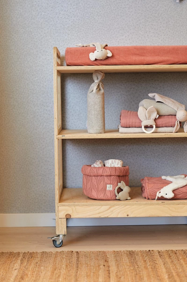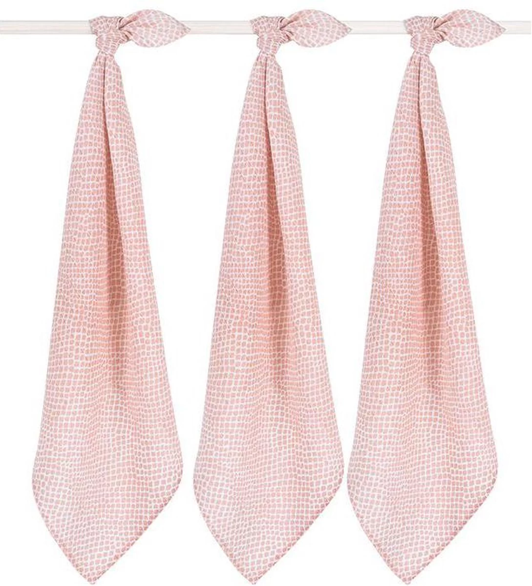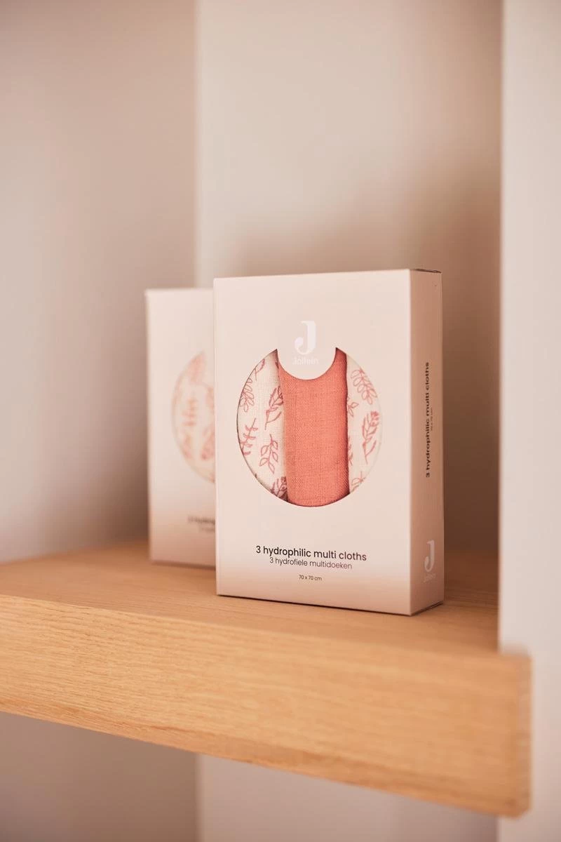 Verkrijgbaar in roze rosewood en bruin chestnut. Er zijn ook hydrofiele doeken in andere prints verkrijgbaar.