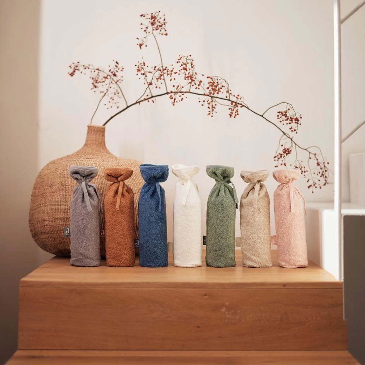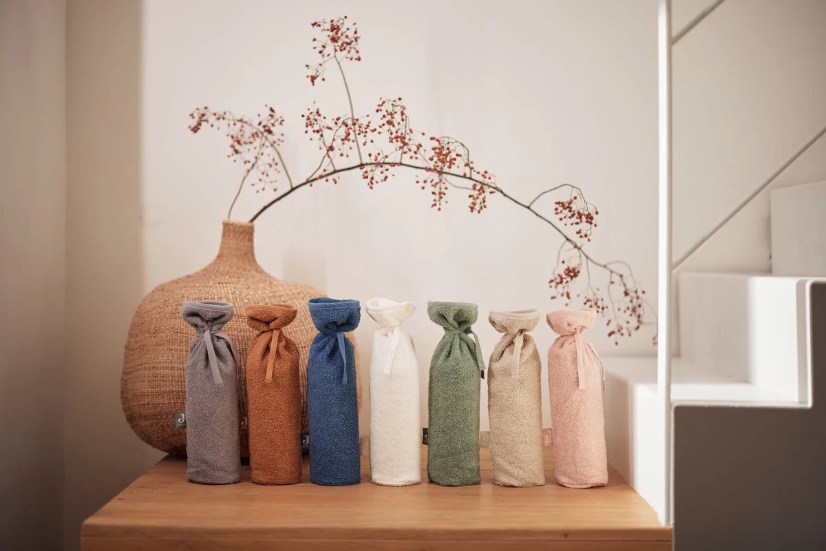 De badstoffen kruikenzakken zijn verkrijgbaar in zeven trendy kleuren.